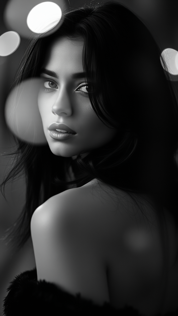 Dark-haired woman captured in a Bruce Davidson-inspired black and white fashion editorial, featuring long exposure photography through an artistic lens. A high-resolution, realistic photo crafted with professional techniques, showcasing a cinematic angle and dynamic backlighting. Elegantly framed with a play of light, the image includes smooth bokeh effects for an immersive, timeless visual experience.