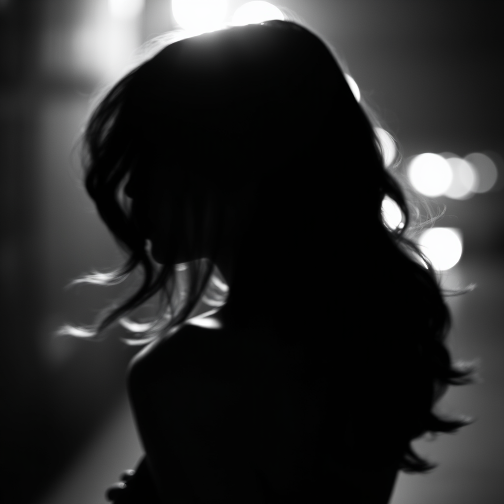 Dark haired woman captured in a high-resolution black and white photograph inspired by Bruce Davidson, embodying a fashion editorial style. Her figure is elegantly blurred through the magic of long exposure photography, seen through an artistic lens. The scene is set with a cinematic angle, showcasing dynamic backlighting that creates a striking silhouette. Soft bokeh adds depth and dreaminess, enhancing the realistic yet artistic quality of the image in this professional photography composition.
