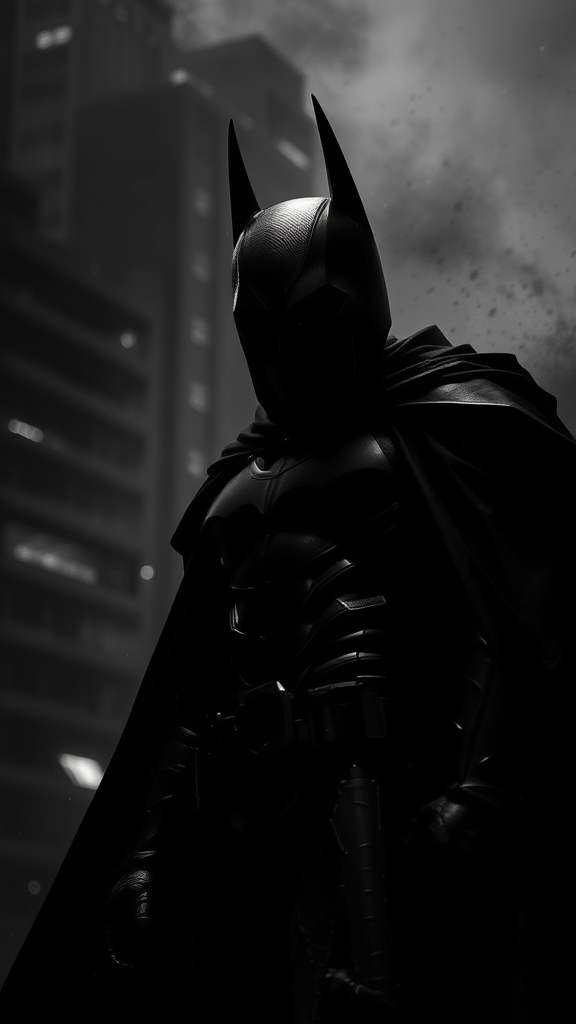 Dark knight intensity, Monochrome imagery, Digital transformation/High-contrast editing, Modern-day setting, Shades of black and gray.