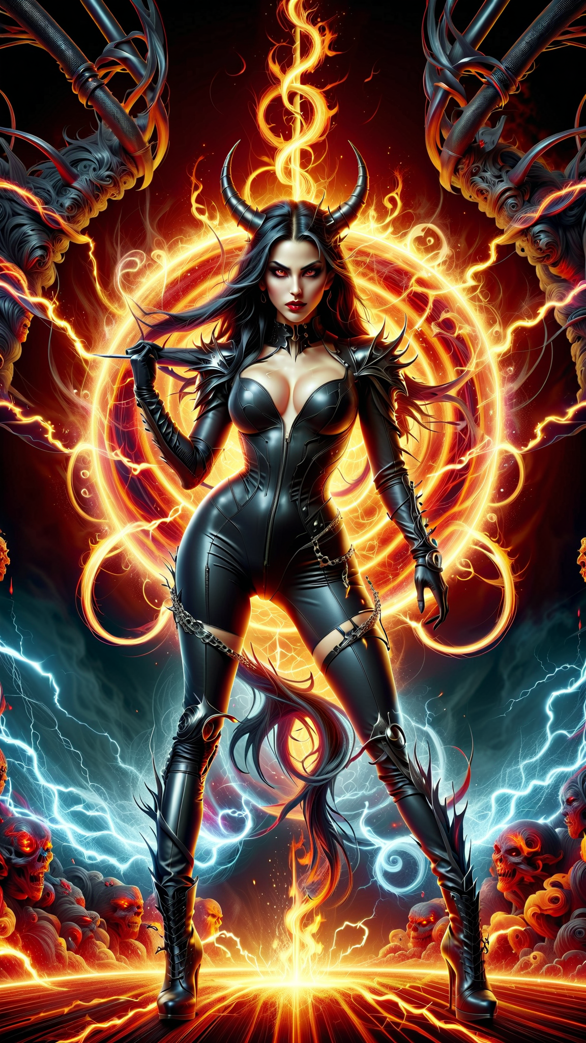 Dark seductiion, devil, fire demon, succubus. Feminine female, seductive. Her aura is hellfire and lust. Tall, athletic, shapely, busty, strong. {{{scarlet red skin}}}, yellow eyes, dark make-up, smoky eyes, blood red lips. Model face, beautiful but evil. Long black hair, way past her back. Two long black devil horns curving up from the sides of her head. Black latex bidysuit covering her neck but exposing her arms and midriff. Delicate silver chains wrapped around her upper arms and shoulders. Long black latex gloves covering her arms, silver spikes on her gloves. Bottom half of bodysuit is held together by two silver rings on each side. Thigh-high black latex boots, stiletto heels and dark red embellishments. Full body pose, aura of red hot flames. Dance with the devil, dance with her...
