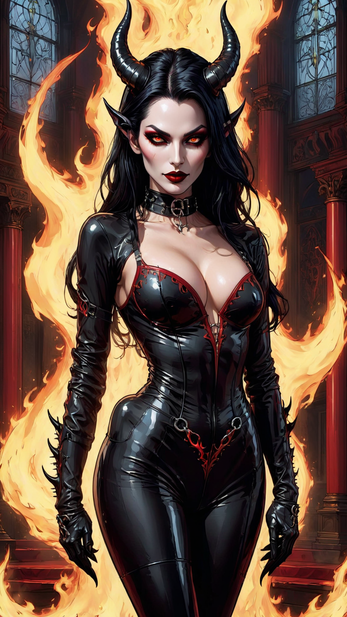 Dark seductiion, devil, fire demon, succubus. Feminine female, seductive. Her aura is hellfire and lust. Tall, athletic, shapely, busty, strong. {{{scarlet red skin}}}, yellow eyes, dark make-up, smoky eyes, blood red lips. Model face, beautiful but evil. Long black hair, way past her back. Two long black devil horns curving up from the sides of her head. Black latex bidysuit covering her neck but exposing her arms and midriff. Delicate silver chains wrapped around her upper arms and shoulders. Long black latex gloves covering her arms, silver spikes on her gloves. Bottom half of bodysuit is held together by two silver rings on each side. Thigh-high black latex boots, stiletto heels and dark red embellishments. Full body pose, aura of red hot flames. Dance with the devil, dance with her...