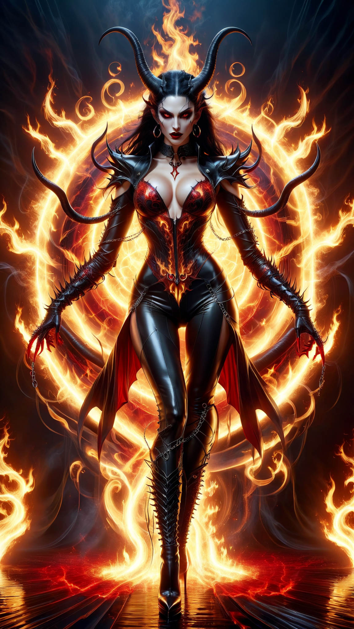 Dark seductiion, devil, fire demon, succubus. Feminine female, seductive. Her aura is hellfire and lust. Tall, athletic, shapely, busty, strong. {{{scarlet red skin}}}, yellow eyes, dark make-up, smoky eyes, blood red lips. Model face, beautiful but evil. Long black hair, way past her back. Two long black devil horns curving up from the sides of her head. Black latex bidysuit covering her neck but exposing her arms and midriff. Delicate silver chains wrapped around her upper arms and shoulders. Long black latex gloves covering her arms, silver spikes on her gloves. Bottom half of bodysuit is held together by two silver rings on each side. Thigh-high black latex boots, stiletto heels and dark red embellishments. Full body pose, aura of red hot flames. Dance with the devil, dance with her...