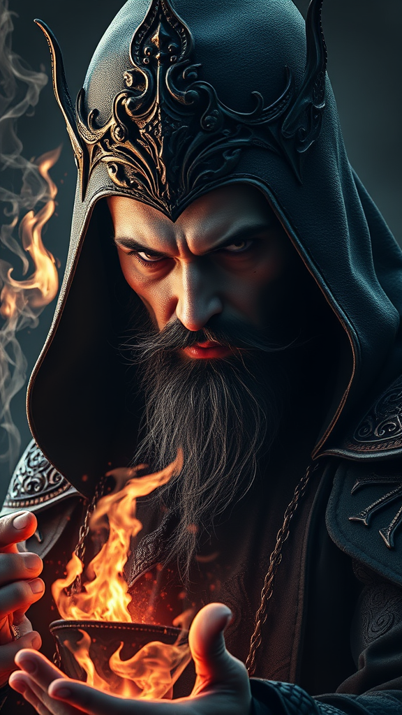 dark sorcerer::, detailed portrait, intricate details, ornate design, volumetric lighting, cinematic atmosphere, dynamic composition, high contrast visuals, matte painting style