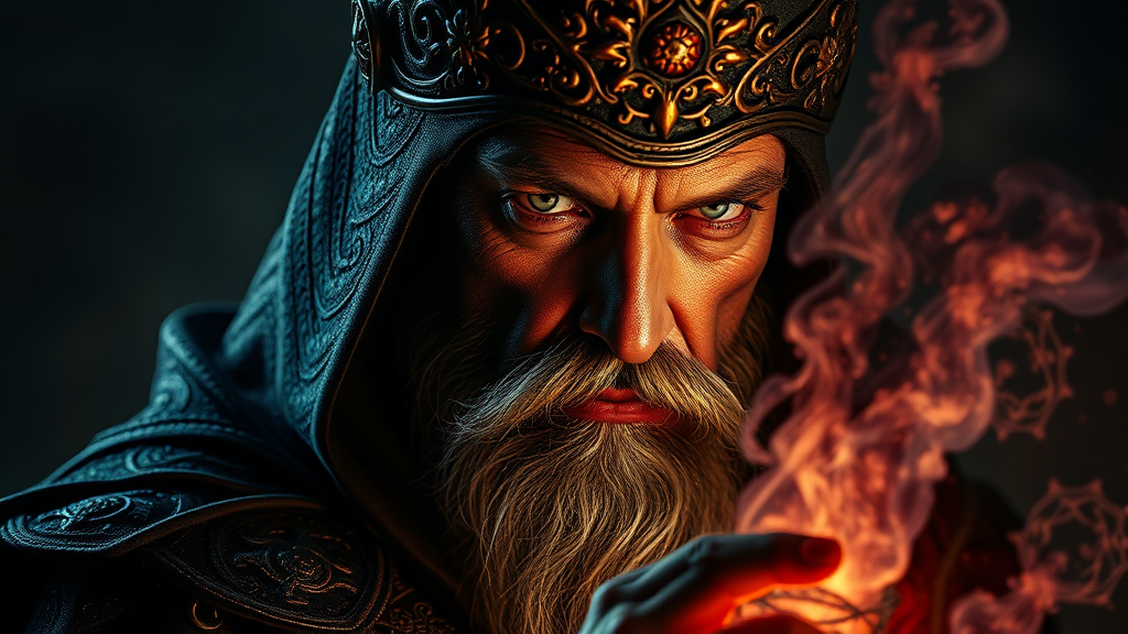 Dark sorcerer, intricate portrait, elaborate, ornate detailing, dramatic volumetric lighting, cinematic presence, masterful composition, strong contrast, matte painting style, enigmatic atmosphere.