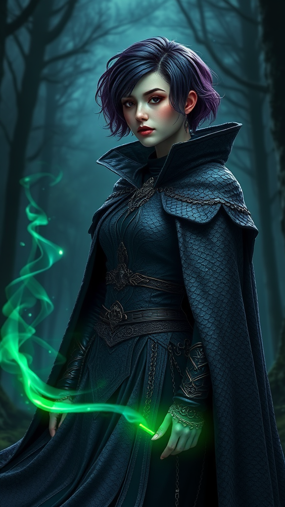 Dark sorceress adventurer adorned in an intricate, elegant costume, with a sweeping cloak woven from dragon scales, set against a mystical fantasy forest landscape. Her hairstyle, a stylish trimmed look with short purple-black hues, fades seamlessly into the dark night ambience. The scene is illuminated by a spectral green neon smoke, casting a magical glow that enhances the air of sorcery. This digital painting focuses on exceptional detail and clarity, rendered in a style reminiscent of VLOP, Artgerm, Greg Rutkowski, and Alphonse Mucha. A captivating matte painting, it balances mystical allure with an otherworldly elegance, creating a true masterpiece of imaginative concept art.