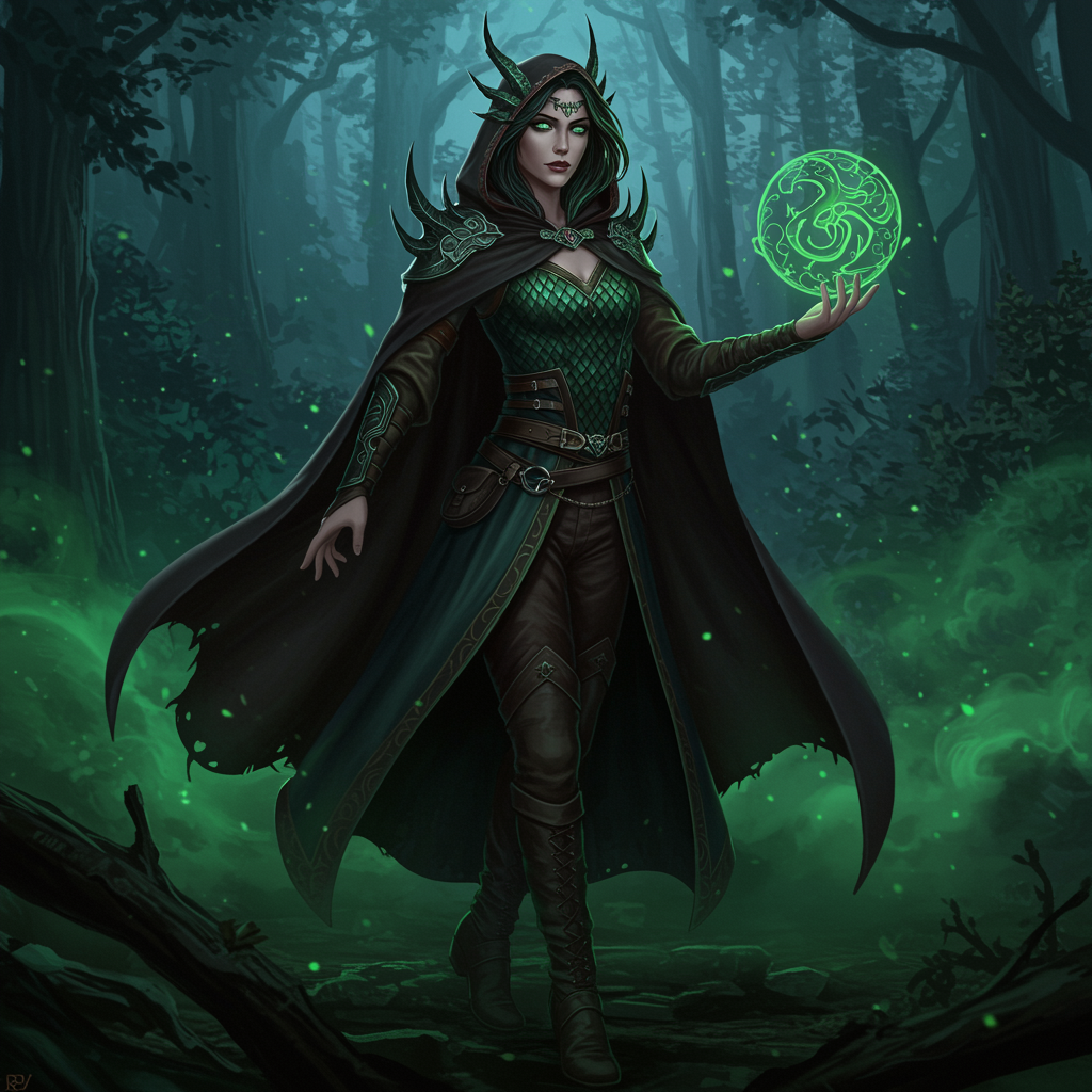 Dark sorceress, adventurous attire, voluminous cloak, mystical forest backdrop, dragon scale embellishments, enchanting magic, sleek hairstyle, nighttime ambiance with subdued lighting, intricate and elegant composition, digital painting, concept illustration, vibrant green mist, matte artistry, inspired by VLOP, Artgerm, Greg Rutkowski, and Alphonse Mucha, breathtaking and detailed 16k resolution, UHD, HDR10. Model considerations: ReV Animated, avoid anatomical inaccuracies like disfigured or mutated features, ensure clarity without blur or artifacts, maintain a polished image without watermarks, logos, or text overlays.