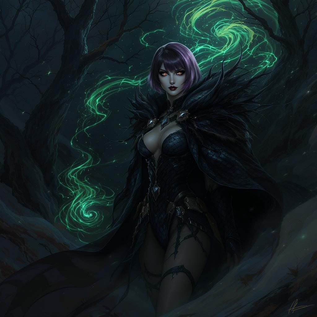 Dark sorceress, explorer attire, voluminous cloak, enchanted woodland scenery, dragon scale pattern, mystical powers, sleek haircut, short purple-black gradient style, dimly lit nocturnal setting, elaborate design, graceful, sharp clarity, intricate illustration, highly detailed digital painting, concept artwork, luminescent green mist, smooth finish, inspired by VLOP, Artgerm, Greg Rutkowski, and Alphonse Mucha, extraordinary creation.