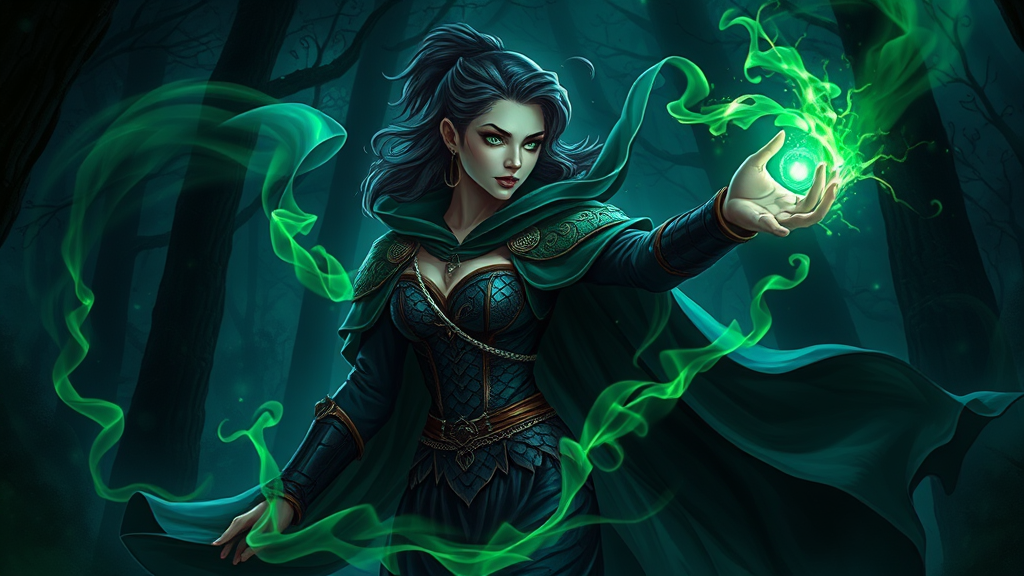 Dark sorceress in an adventurer costume with a flowing cloak set in a mystical fantasy forest, adorned with dragon scale motifs and wielding powerful fantasy magic. She possesses a stylish trimmed hairstyle, enveloped in the dim glow of a dark, enchanted night. The scene is intricate and elegant, with a clear focus on the sorceress, illustrated in a digital painting style. Green neon smoke swirls around her, creating a dynamic atmosphere, reminiscent of masterpieces by VLOP, Artgerm, Greg Rutkowski, and Alphonse Mucha. The artwork is in ultra-high definition, showcasing the fine details of a matte painting, capturing the essence of fantasy magic with a sense of wonder and mysticism.