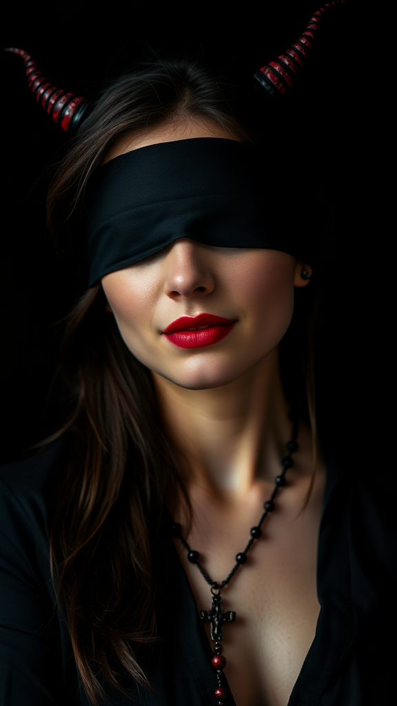 dark-theme, one woman, charming, demon horns, blindfolded, subtle smile, closed mouth, small breasts, upper body, wearing a rosary and blouse, UHD, HDR, 8K, avoiding duplication or disfigurement, natural form, clear focus, unblemished visage, harmonious features, balanced eyes, proportional neck, normal fingers, well-composed, high resolution, fully in frame, sharp details, free from artifacts, no watermarks or additional text, fully rendered, single cohesive image, accurately drawn.