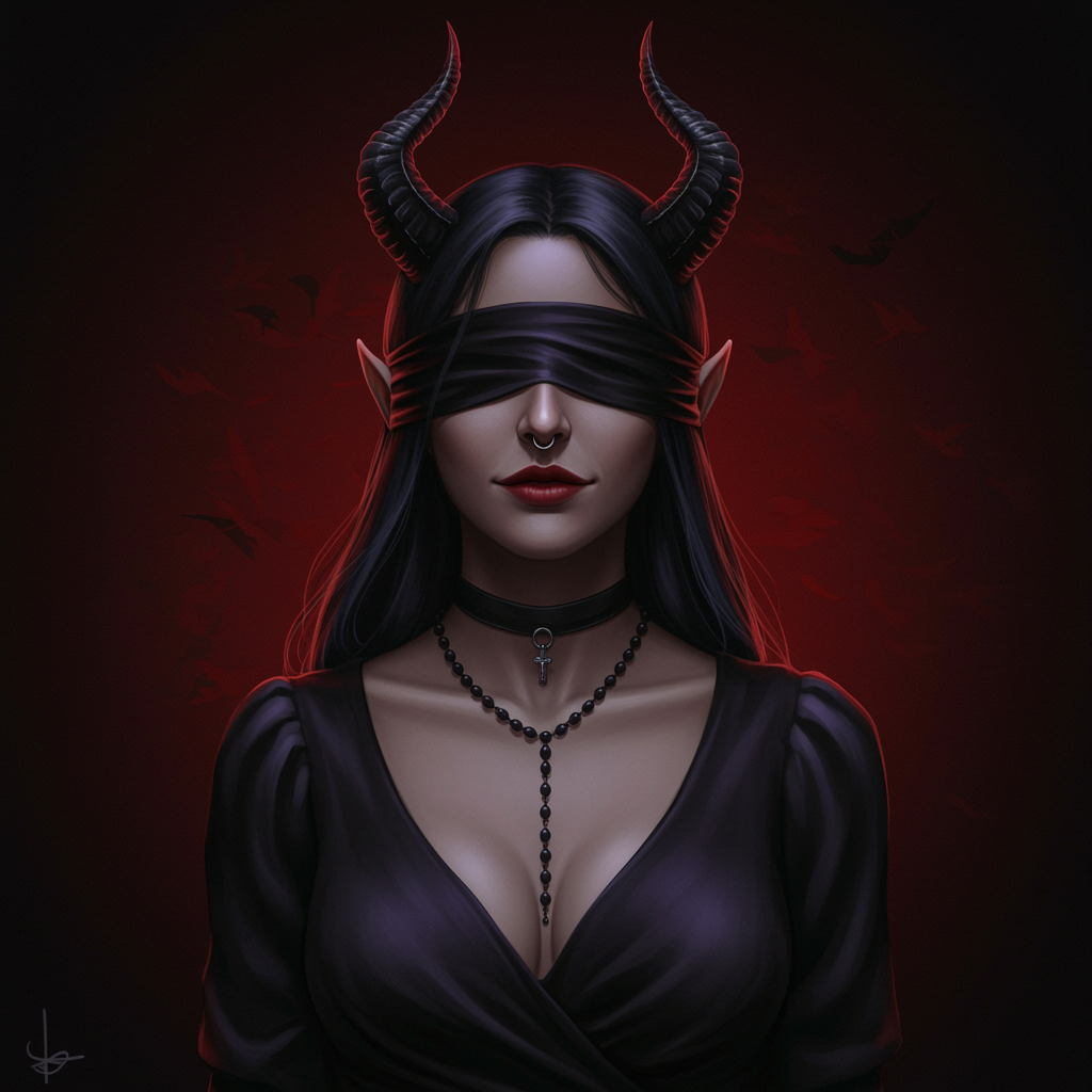 View this AI-generated image featuring dark theme 1 woman charming demon horns blindfold subtle smile smooth nose gentle expression small upper body adorned with a rosary elegant blouse uhd quality vivid colors 8k resolution inner tranquility serene presentation harmonious appearance balanced featur