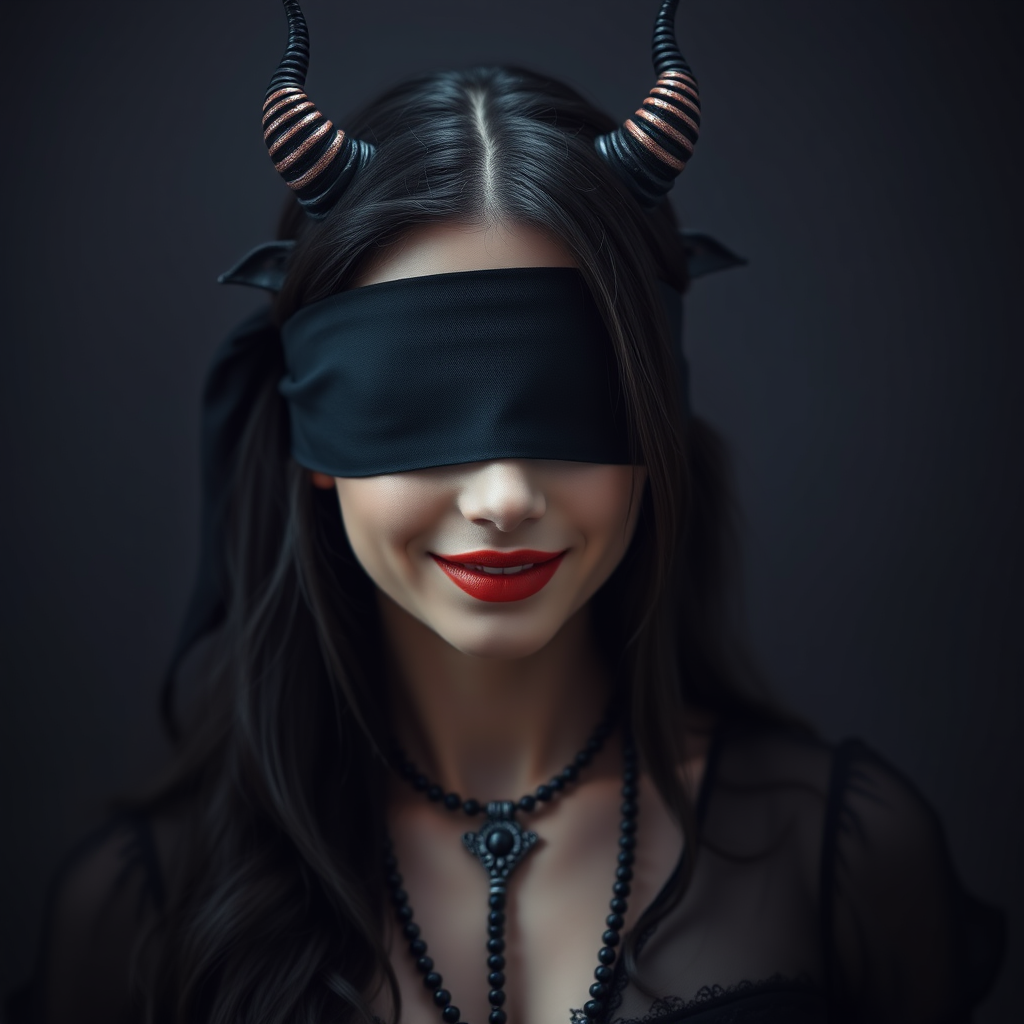 dark-theme, woman, cute, demon horns, blindfold, smile, closed mouth, small breasts, upper body, rosary, blouse, UHD, HDR, 8K, elegant, mystical, alluring, softly lit, intricate details, atmospheric, clear features, graceful pose, focused expression, mysterious aura.