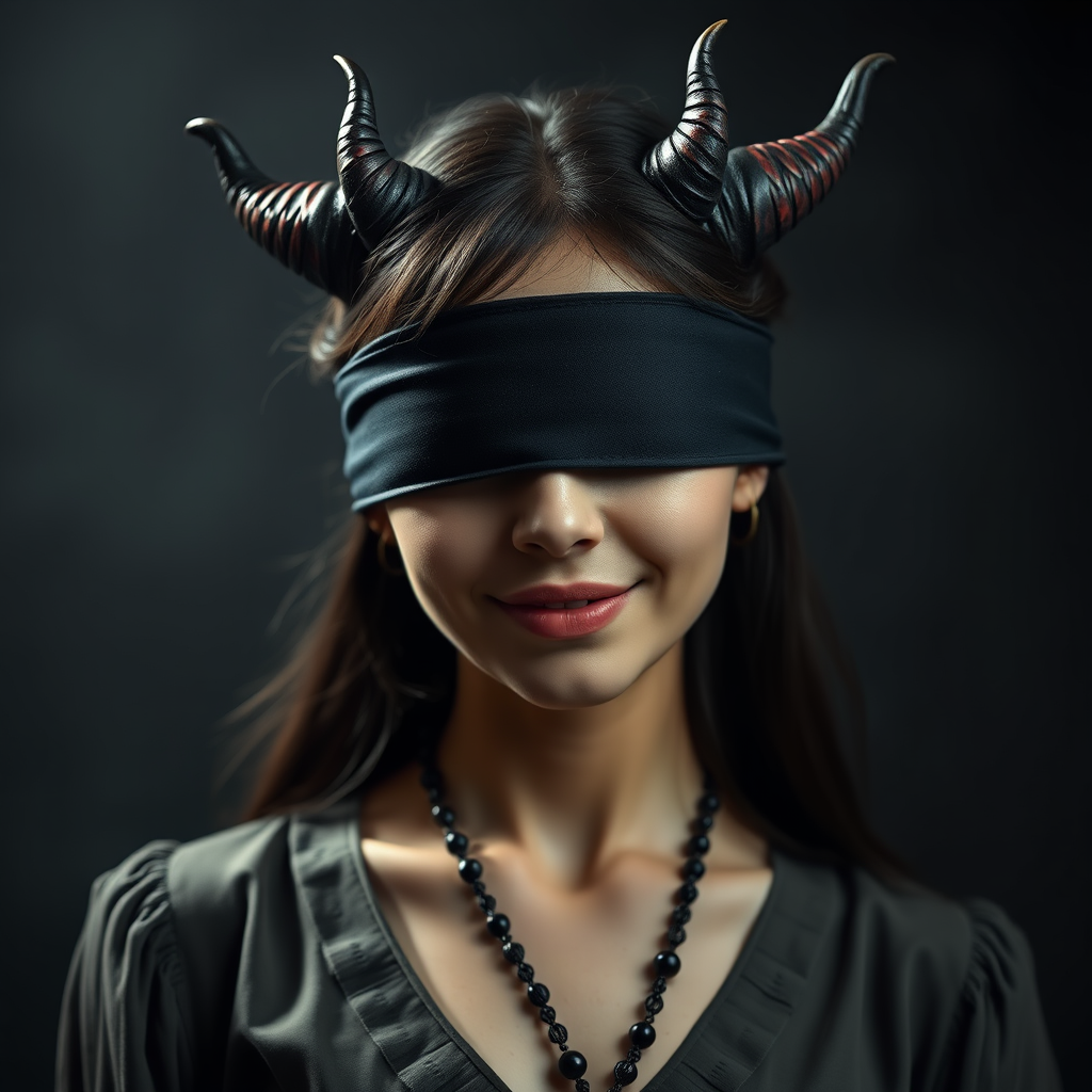 dark-theme, woman with cute demon horns, blindfolded smile with closed mouth, small breasts, upper body focus, wearing a rosary and blouse, captured in UHD HDR 8K quality, ensure clear and detailed imagery, no duplication or disfigurement, maintain realistic proportions with natural eyes and hands, avoid low resolution, ensure all elements are within frame, no blur or artifacts, no text or logos in image, realistic style without cartoon elements.