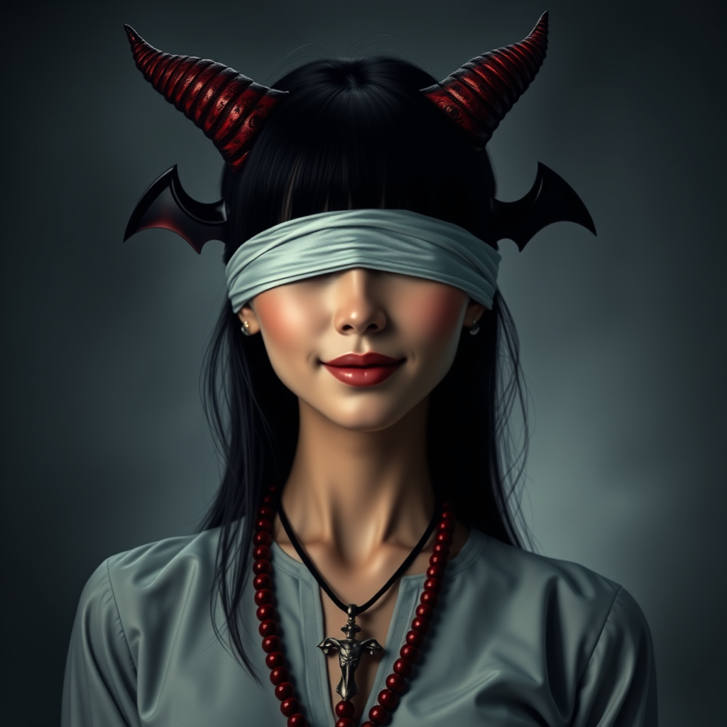 dark-theme, woman with cute demon horns, wearing a blindfold, smiling gently with a closed mouth, small breasts, upper body highlighted, adorned with a rosary, dressed in a blouse, depicted in UHD, HDR, 8K quality, slightly elongated neck, softly detailed hands, maintaining clarity and focus without distractions, presented in a realistic and artistic style.