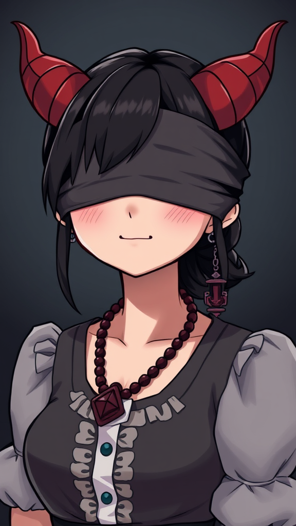 Dark-themed, 1 woman, cute, demon horns, blindfolded, smiling with a closed mouth, small breasts, upper body, wearing a rosary and blouse, UHD, HDR, 8K quality. Maintain focus on character clarity, avoid duplication or deformation, ensure natural eye alignment, standard neck length, proper hand anatomy. Ensure overall sharpness without low resolution, keep fully in frame, without any visual artifacts or interruptions like watermarks or text. Avoid cartoonish style, maintain realism.