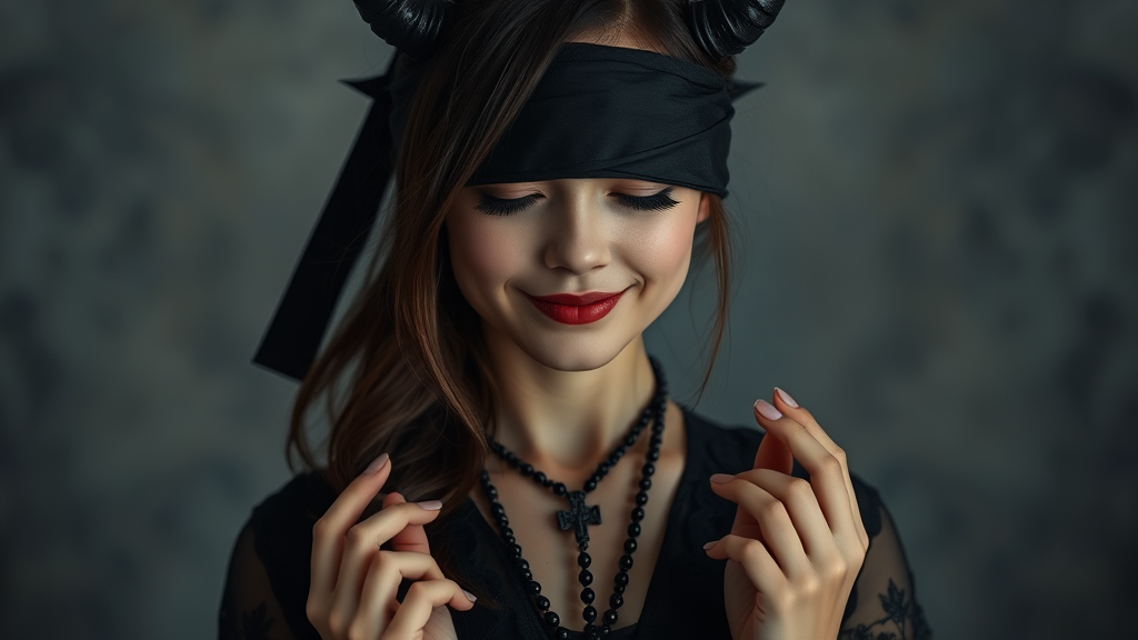 Dark-themed scene featuring a cute woman with demon horns, wearing a blindfold and smiling gently with a closed mouth. She has small breasts and an upper body adorned with a rosary over a blouse. The image is captured in ultra-high definition with high dynamic range for vibrant detail. Her expression is serene, exuding a mysterious charm. The composition is elegant and focused, avoiding duplication or disfigurement. Her eyes are delicately closed under the blindfold, and her hands are gracefully positioned, free from abnormalities. The background is subtly blurred to keep the focus on her, ensuring clarity and avoiding any distractions such as out-of-frame elements or visual distortions.