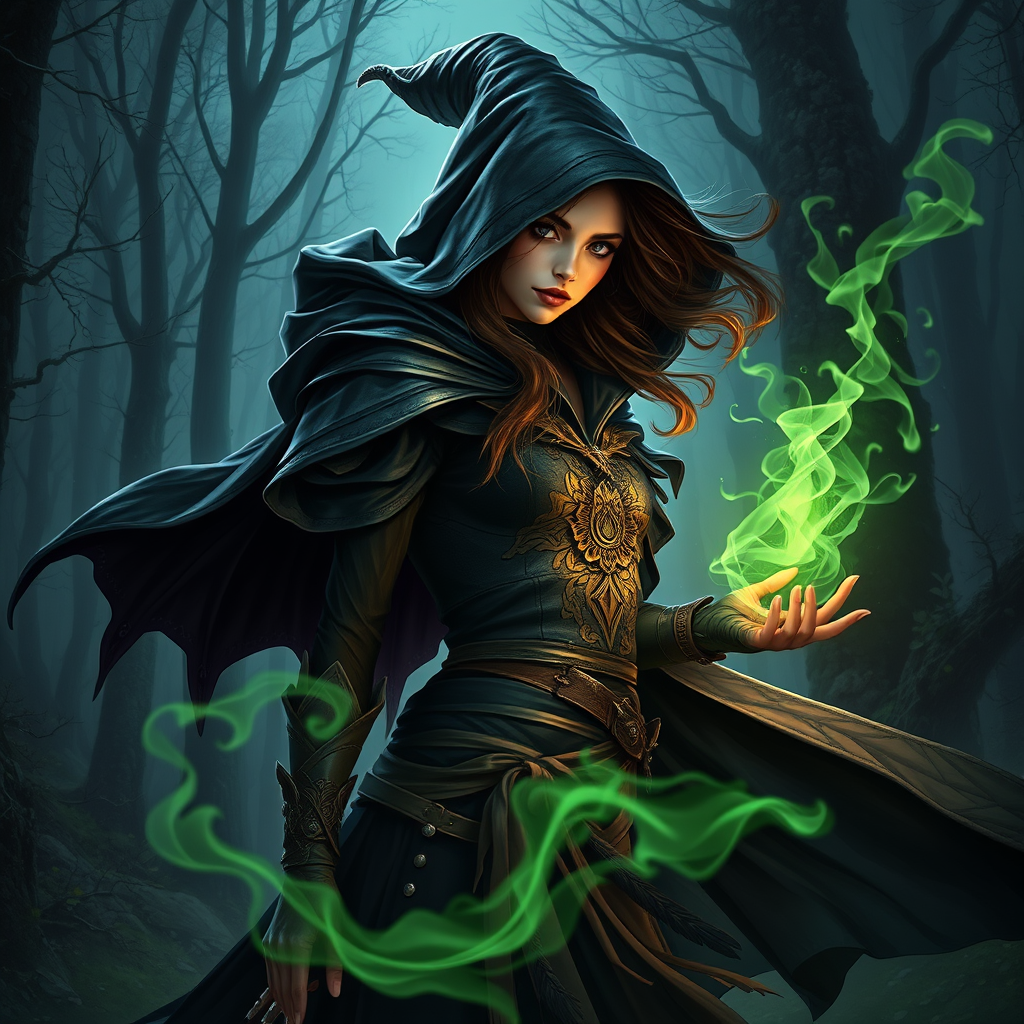 Dark witch, adventurer attire, flowing cloak, mystical forest backdrop, dragon scale texture, enchanting magic, styled hair, night ambiance, intricate and elegant details, sharp focus, digital painting, concept art, luminous green smoke, matte finish, inspired by VLOP, Artgerm, Greg Rutkowski, and Alphonse Mucha, masterpiece quality, UHD, HDR10, high resolution.