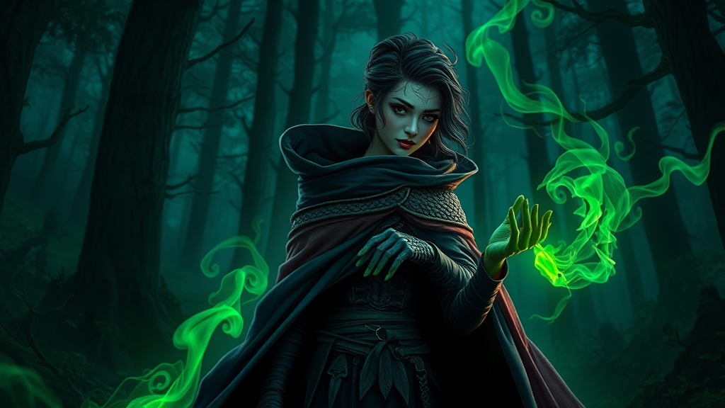 Dark witch adventurer in a fantasy forest landscape, adorned with a big cloak and dragon scales. Her elegant, trimmed hairstyle complements the scene as she stands amidst dark light of night, casting intricate and magical charms. The atmosphere is vivid with green neon smoke swirling around, enhancing the mysterious and enchanting ambiance. The scene is depicted in a style reminiscent of works by VLOP, Artgerm, Greg Rutkowski, and Alphonse Mucha, capturing a masterful blend of illustration and digital painting. It exhibits a breathtaking clarity in Ultra High Definition and HDR, achieving a truly masterpiece-level quality and depth of expression.