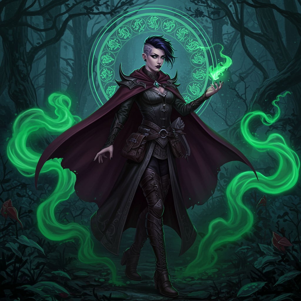 Dark witch adventurer in an elaborate costume featuring a large flowing cloak, set against a mystical fantasy forest. Her attire is adorned with dragon scales, shining with fantasy magic. She sports a trimmed, stylish haircut with short purple-black faded hair. The scene unfolds in a dark night shrouded with subtly illuminated, intricate details. The artwork, a digital masterpiece, reflects the styles of VLOP, Artgerm, Greg Rutkowski, and Alphonse Mucha. Green neon smoke swirls through the scene, enhancing the mysterious atmosphere. The matte painting showcases an elegant and clear focus on the witch, bringing the entire composition into harmonious balance, radiating intricate elegance.