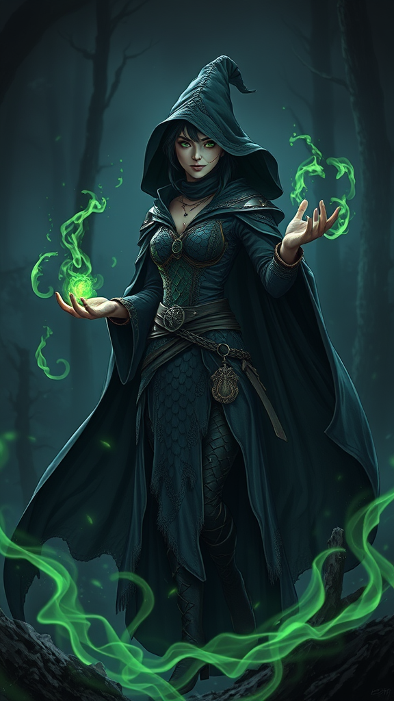 Dark witch in an adventurer costume with a large, flowing cloak, set in a fantasy forest landscape. Her outfit is adorned with dragon scales, exhibiting fantasy magic emanating from her hands. She sports a trimmed hairstyle and stands in an intricate, elegant pose, captured in dark light under a night sky. The scene is highly detailed, featuring a clear focus in an illustration style. The digital painting incorporates elements of matte painting with green neon smoke swirling around. Inspiration is drawn from the works of VLOP, Artgerm, Greg Rutkovsky, and Alphonse Mucha, designed to be a masterpiece in high resolution, 16k UHD with HDR10. The artwork avoids common pitfalls like bad anatomy, distorted features, and low resolution elements, maintaining a clean, professional appearance devoid of artifacts or distractions.