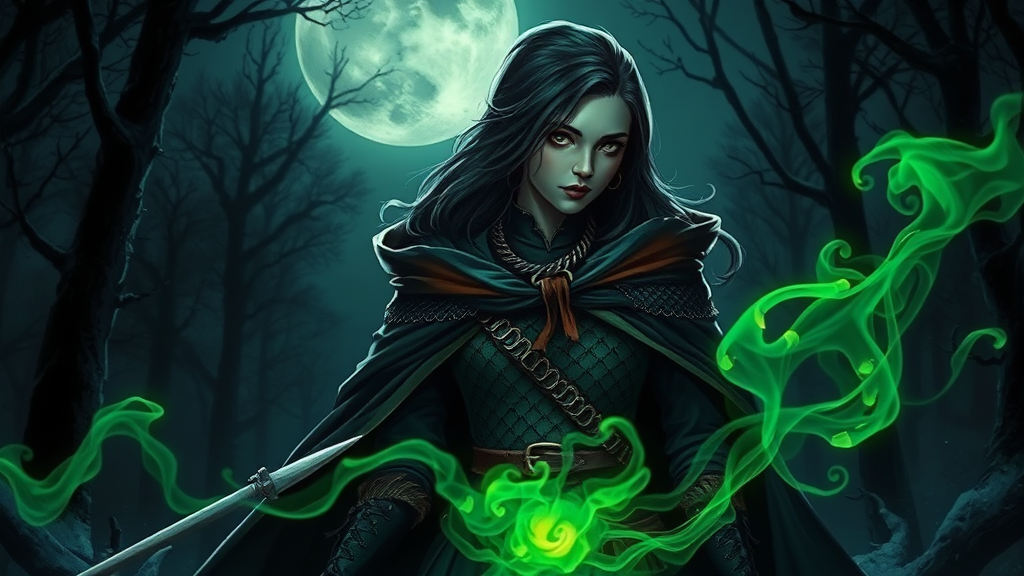 Dark witch in an adventurer's costume with a large cloak in a fantasy forest setting, featuring dragon scales and powerful magic. She has a trimmed hairstyle, set against a dark, moonlit night, with intricate and elegant details. The illustration is in digital painting style, inspired by VLOP, Artgerm, Greg Rutkowski, and Alphonse Mucha, with a masterpiece quality. The scene includes green neon smoke, resembling a matte painting, captured in UHD.
