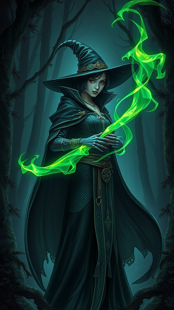 Dark witch in an adventurer's costume with a majestic cloak standing in a fantasy forest landscape. Her attire is adorned with dragon scales, and she wields fantasy magic with green neon smoke swirling around her. Her trimmed hairstyle reflects an elegant and intricate design, highlighted under the dark, enchanting light of night. This scene captures a clear focus within an elegant illustration, reminiscent of the styles of VLOP, Artgerm, Greg Rutkovsky, and Alphonse Mucha. The piece is a digital painting, concept art masterpiece, at an ultra-high definition, 16k resolution with HDR10 quality, and utilizes matte painting techniques for a rich, vibrant texture.
