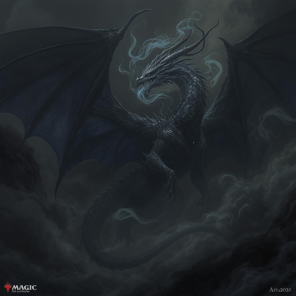Darkness envelops a majestic and colossal dragon, its intricately scaled wings unfurled, exuding an aura of regal mystery. This Magic: The Gathering-inspired scene features the dragon entwined in swirling smoke, set against a backdrop of dense, dark fog. The artwork draws from the styles of Andrei Riabovitchev, Massimo Caggese, Peter Mohrbacher, with an ominously intricate aesthetic. Crafted in an octane-rendered, Moebius-like style infused with the dramatic, orthodox symbolism found in Arney Freytag's work, the dragon strikes a gorgeous pose. The composition, worthy of ArtStation's finest, achieves perfection with its dramatic lighting and shadows, embodying the depth of concept art where ambient magic realism prevails. Rendered in hyper-maximalist detail, this 8K resolution visual is a cinematic, tribal dark fantasy masterpiece, stylized to its fullest potential yet subtly modified to enhance its core essence.