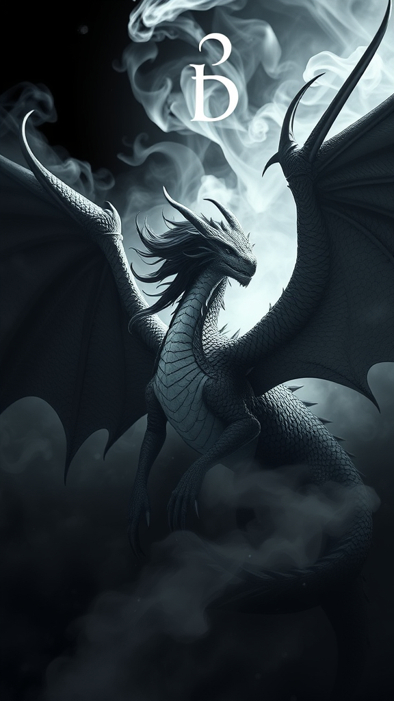 Darkness envelops a stunning royal dragon, with expansive scale wings and flowing, wind-swept black hair. Its pale skin provides a stark contrast amidst a swirling cascade of spiral smoke and ethereal white fog, casting an otherworldly glow around it. Designed in the visionary styles of Andrei Riabovitchev, JohnnyD, Massimo Caggese, Peter Mohrbacher, and infused with the intricate detail of Ominous, Octane, and the surreal touches of Moebius and Arney Freytag, this scene evokes a high-fashion photo shoot. The dragon strikes a captivating pose within ArtStation's portal, dramatic lighting and shadows playing upon its form, interwoven with Orthodox symbolism. This piece, a masterwork of concept art blending ambient tones and magical realism, emerges in a dazzling 8k resolution, an intricate, hyper-maximalist portrayal of tribal dark fantasy.