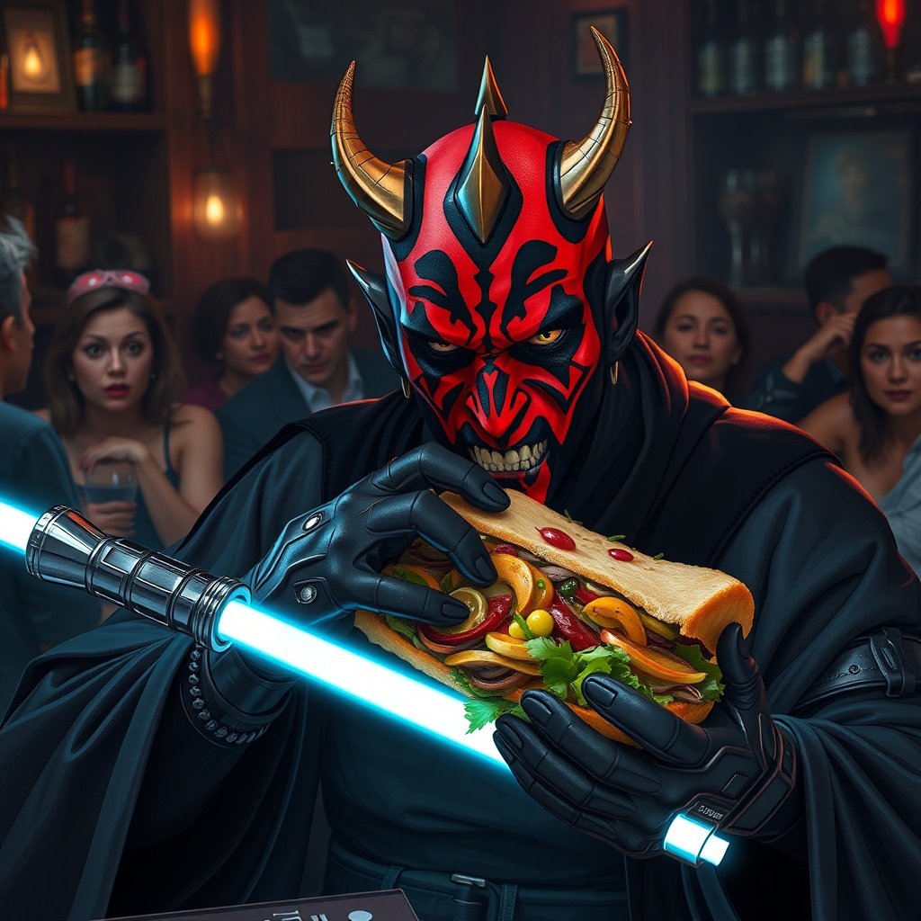 A fierce Darth Maul, with his red and black tattooed face, savors a sandwich, seated in a dimly lit cantina. His dual-bladed lightsaber rests beside him, while he exhibits a rare moment of calm amidst the chaos. The sandwich is overflowing with exotic alien ingredients, adding a splash of vibrant colors against the dark ambiance. Background patrons steal curious glances, bridging the ordinary with the extraordinary in this intergalactic setting.