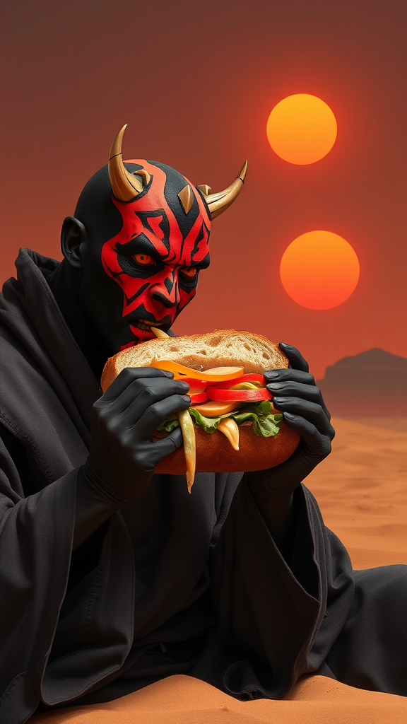 Darth Maul savoring a galactic sandwich under the twin suns of Tatooine, his ominous presence contrasting with the mundane act of enjoying a meal, vibrant colors of alien ingredients spilling from the crusty bread as sand lightly swirls around his Sith robes.