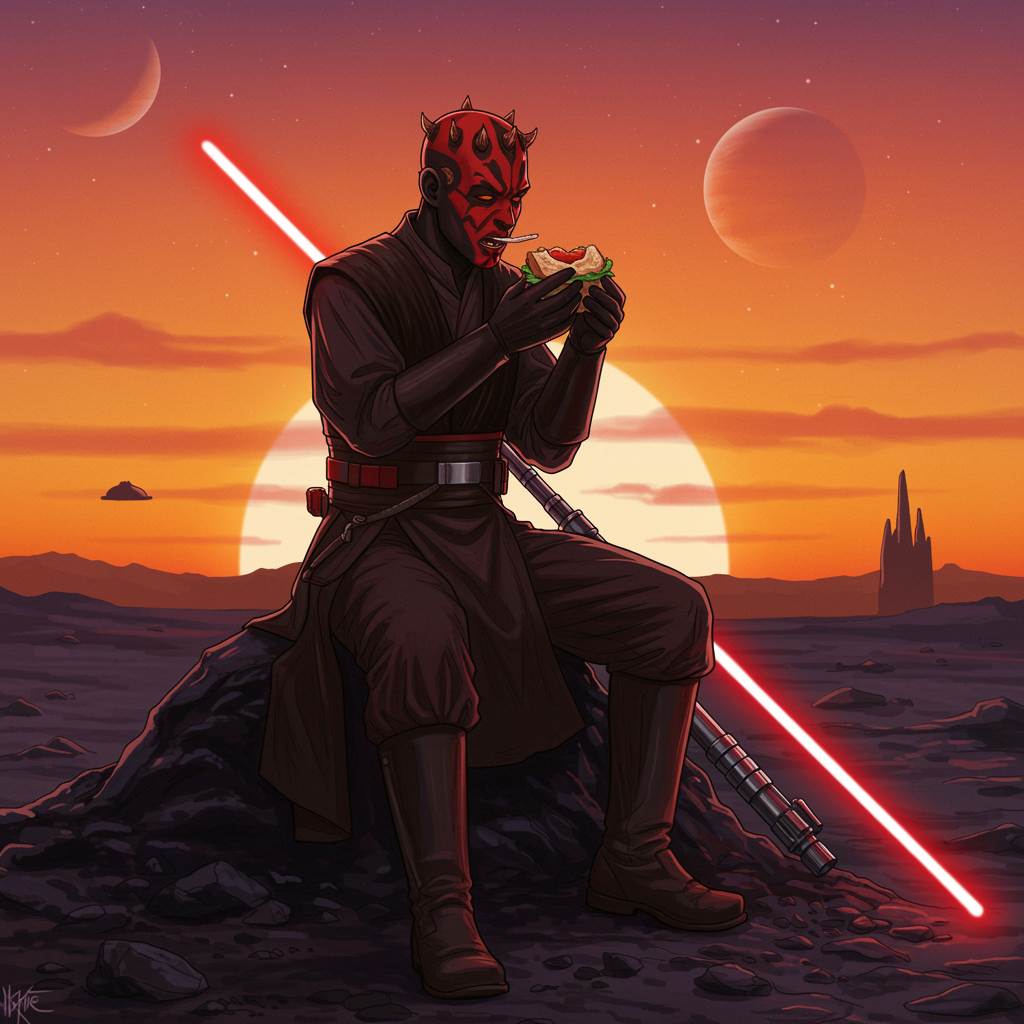 Darth Maul savoring a gourmet sandwich on a distant planet, the dual sunsets casting an eerie glow on his face as he contemplates the unexpected blend of flavors, his lightsaber resting beside him on the rocky surface.