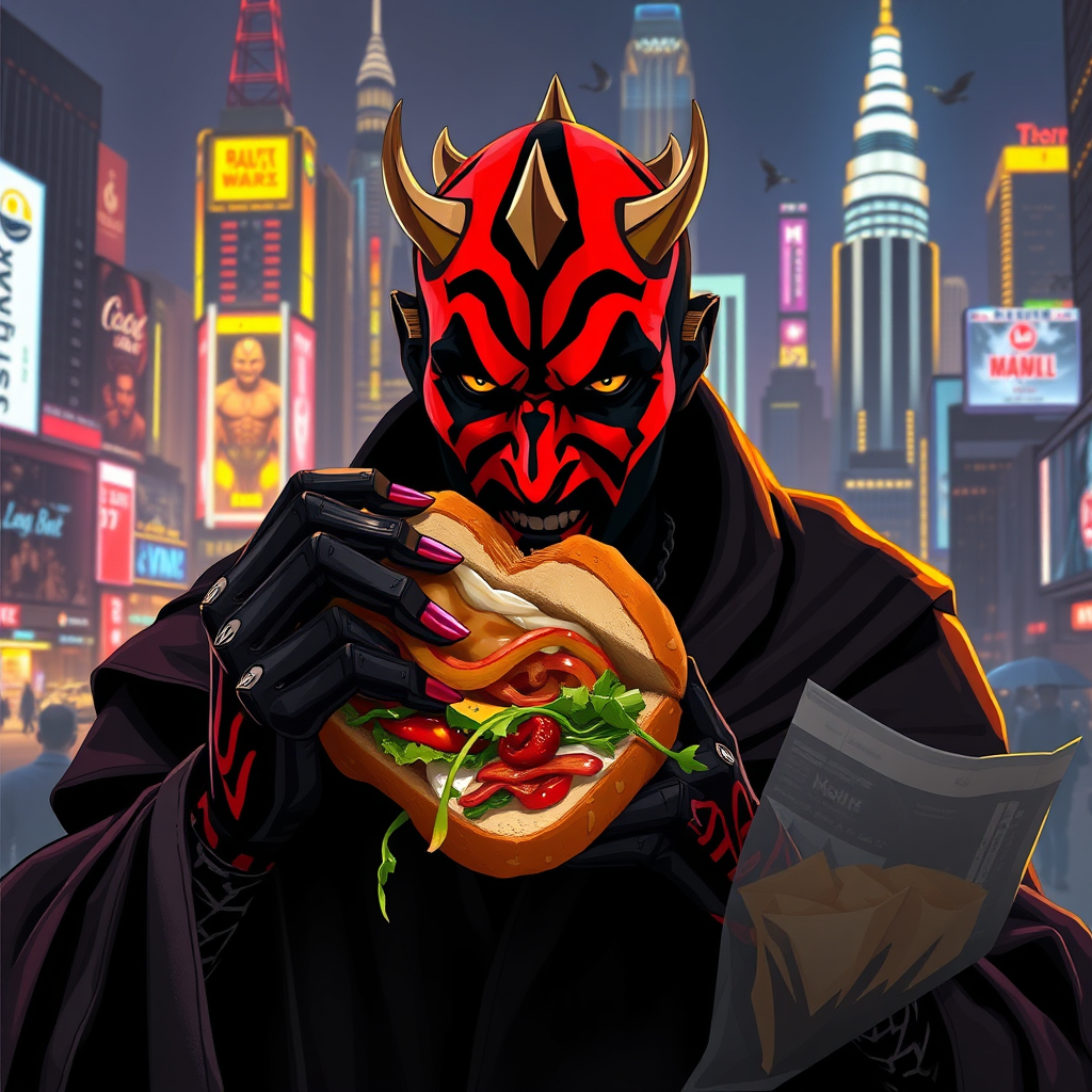 Darth Maul savoring a gourmet sandwich under the neon glow of Coruscant's cityscape, colorful ingredients spilling out as he takes a hearty bite, dark cloak slightly fluttering in the bustling urban breeze.