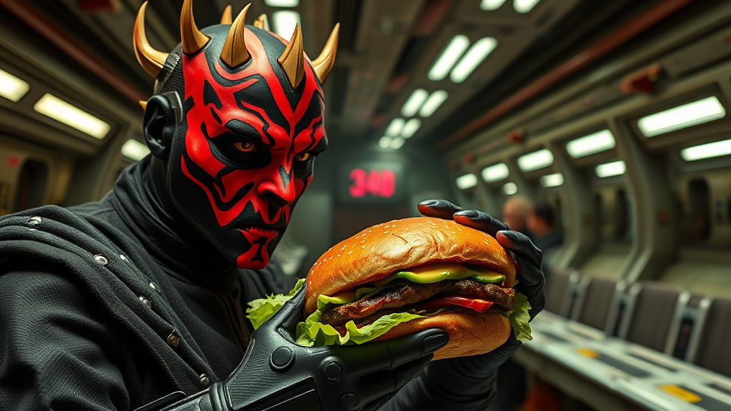 Darth maul savors a crusty bantha-burger with avocado mayo on a soggy Sarlacc-red bun, amidst the silenced hum of a star destroyer's empty mess hall, the soft crunch of lettuce a respite from the ominous breathing of the cyborg's suit.