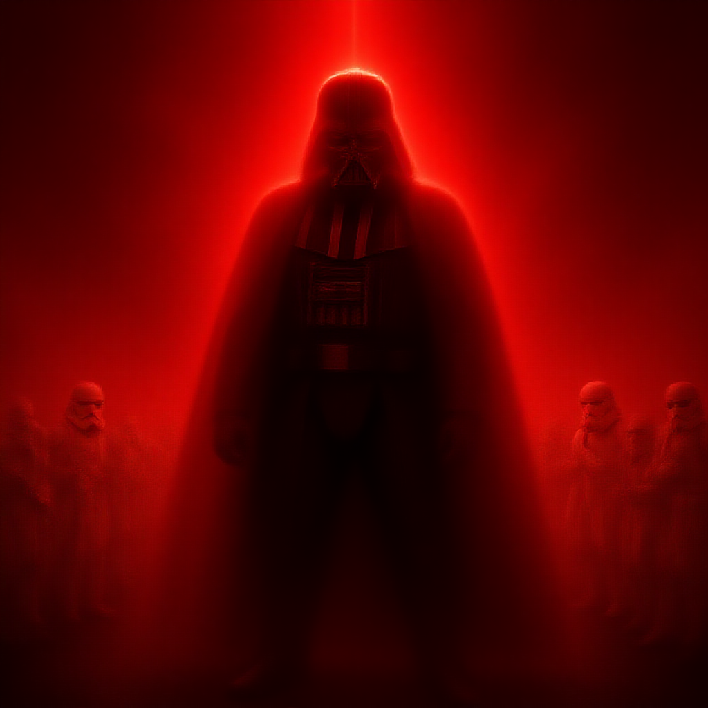Darth Vader stands amidst a breathtaking, ethereal red light, casting an otherworldly glow. In the background, an army of stormtroopers forms a formidable, orderly formation, their presence echoing a sense of symmetry and strength. The scene captures a dramatic balance between Vader's imposing figure and the disciplined ranks of his troopers, encapsulating a moment of power and unity in the midst of an alien landscape.
