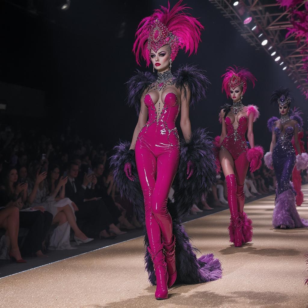 Dazzling ensembles, avant-garde fashion: models adorned in impeccably tailored pink patent leather, adorned with raven feathers and luxurious boas, towering in high heels, shimmering with glitter, showcasing intricate details and runway elegance, under the glow of spotlights --ar 4:5