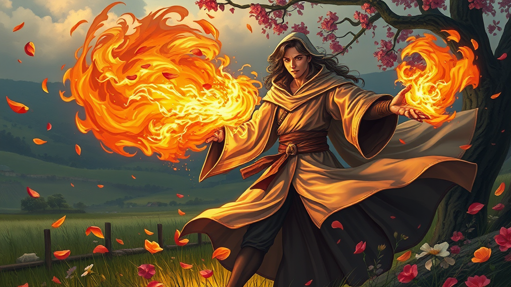 D&D character, full body photo of the most beautiful artwork, mage in a flowing silk robe, igniting fire magic, inspired by Ed Blinkey, Atey Ghailan, Jeremy Mann, Greg Manchess, Antonio Moro, intricate and high detail with sharp focus, dramatic lighting, petals swirling around, set in a picturesque countryside, captured in an action pose casting a spell, magic swirling within a dynamic canvas-like frame. Reflects the style of Greg Rutkowski, combining cartoon elements with 3D photorealism.