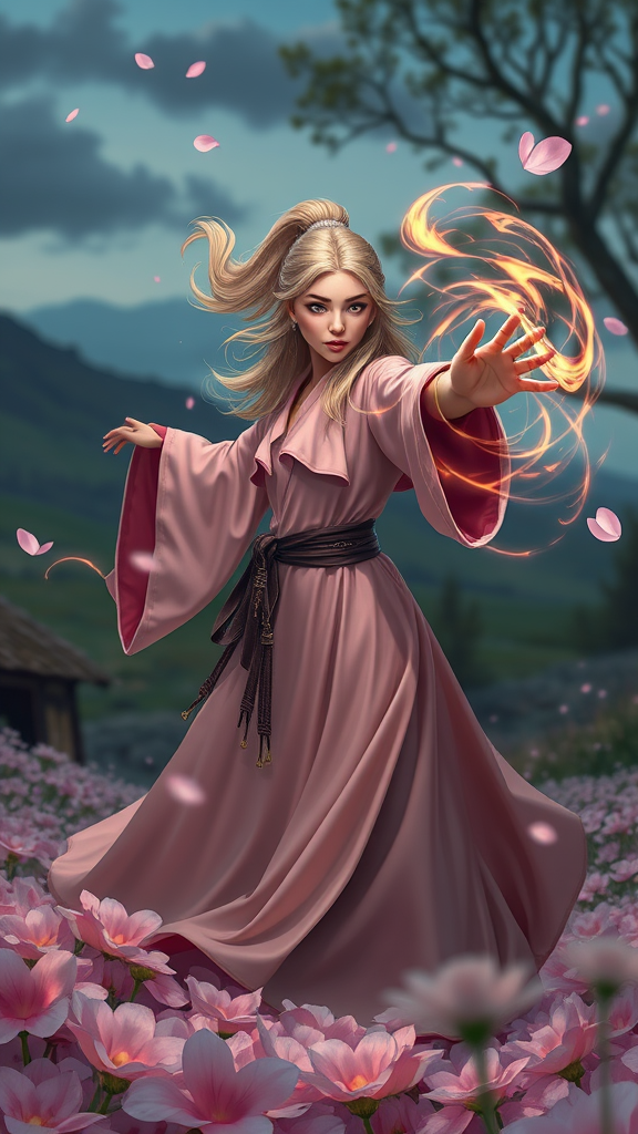 D&D character modelshoot style full shot body photo beautiful artwork mage silk robe fire magic inspired by Ed Blinkey Atey Ghailan Jeremy Mann Greg Manchess Antonio Moro intricate high detail sharp focus dramatic Greg Rutkowski petals countryside action pose casting a spell swirling magic canvas frame cartoon 3d photorealistic vibrant captivating setting showcasing character's elegance and power graceful motion realistic anatomy perfectly crafted hands expressive face captivating beauty enchanting spellcasting dynamic energy against scenic backdrop