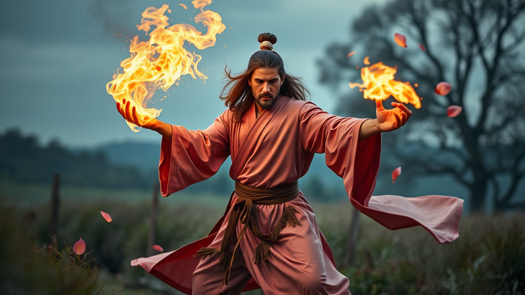 D&D character modelshoot style full shot body photo mage in silk robe performing fire magic set within a countryside backdrop inspired by Ed Blinkey Atey Ghailan Jeremy Mann Greg Manchess Antonio Moro Greg Rutkowski featuring intricate high detail with sharp focus displaying dramatic action pose casting a spell with swirling magic the scene beautifully composed as if within a magic canvas frame featuring petals gently floating accentuating the mage's graceful motion.