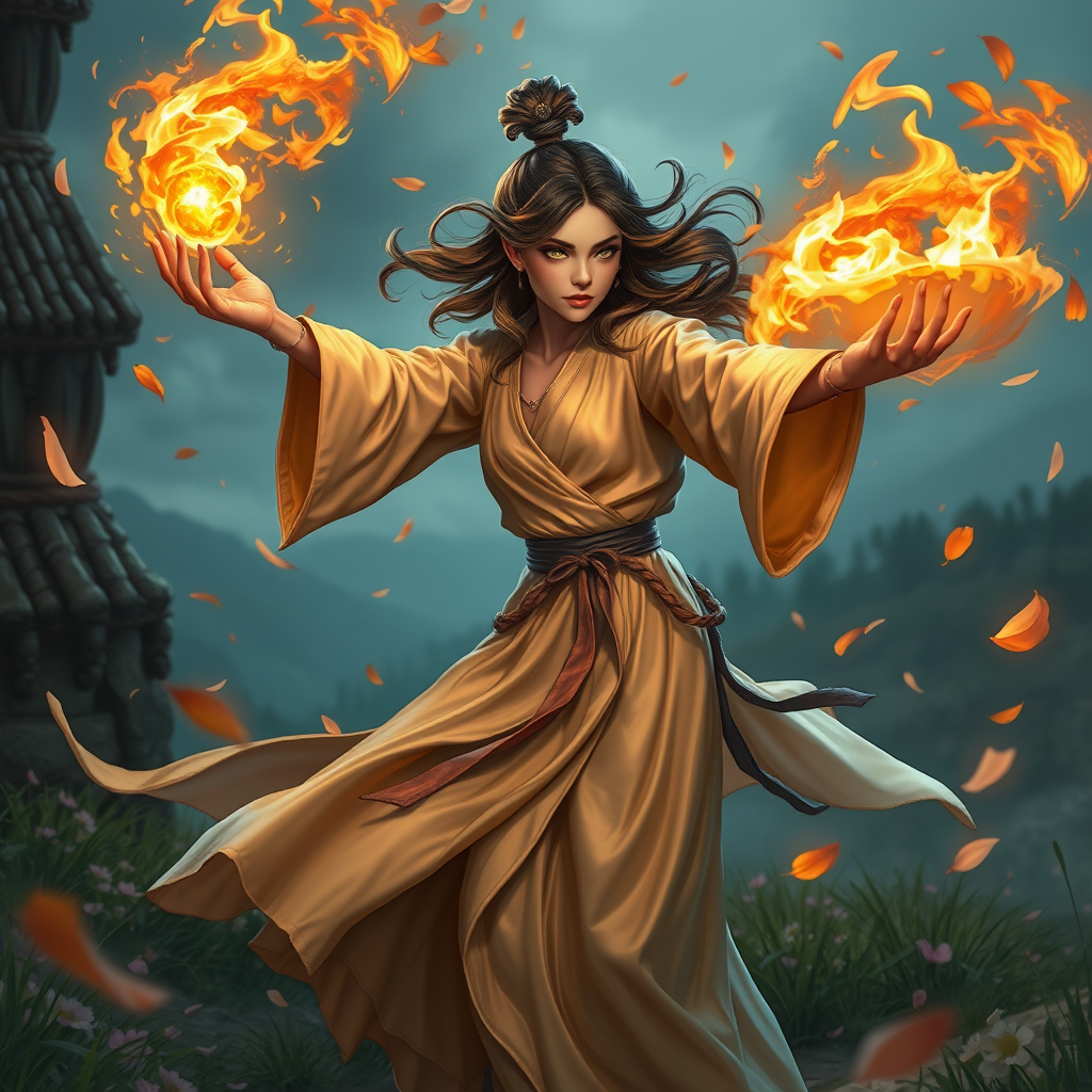 D&D character modelshoot style full shot body photo of the most exquisite artwork in the world, enchanting mage adorned in a flowing silk robe, wielding fire magic, inspired by visionary artists Ed Blinkey, Atey Ghailan, Jeremy Mann, Greg Manchess, and Antonio Moro. Intricately detailed and sharply focused, dramatic like Greg Rutkowski's creations, with petals swirling around in a picturesque countryside setting. Captured in a dynamic action pose, casting a powerful spell with swirling magic enveloping the scene. The art embraces a blend of cartoon and photorealistic 3D styles, framed within a magical canvas of high quality. The character is portrayed with perfect anatomy, vividly expressive, and finely detailed, showcasing beautiful hands and a balanced figure.