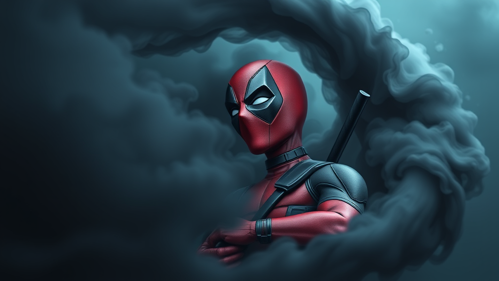 Deadpool, enveloped in a swirling dark mist, reimagined as a caricature in the style of Constantin Brâncuși, radiates serenity and dynamism. This surreal masterpiece captivates with cool tones, blending the playful essence of the character with the minimalist elegance of modernist sculpture, creating a harmonious and intriguing visual experience.
