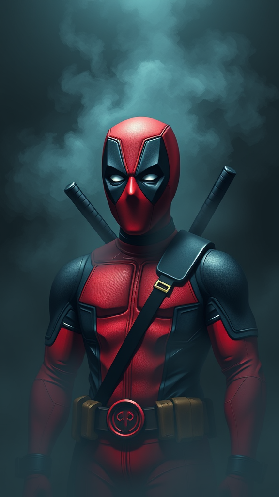 Deadpool enveloped in dark mist, reimagined in the caricature style of Constantin Brâncuși, exuding a serene yet dynamic presence in a surreal masterpiece of cool tones.