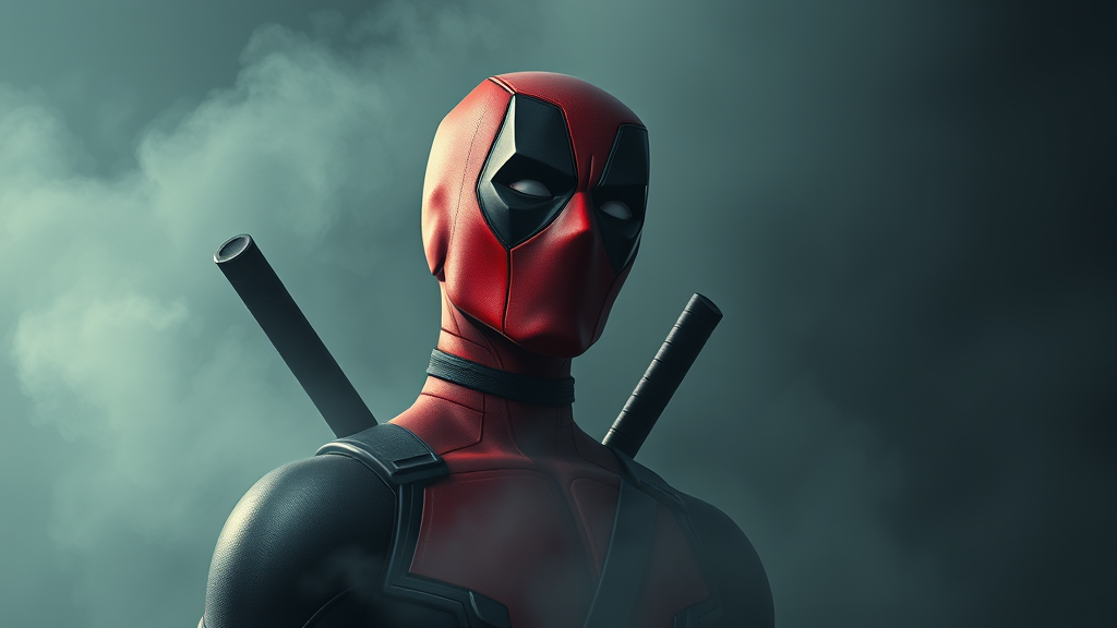 Deadpool in a dark mist, depicted as a caricature in the style of Constantin Brâncuși, exuding a serene yet dynamic presence, surrounded by a surreal masterpiece of cool tones.