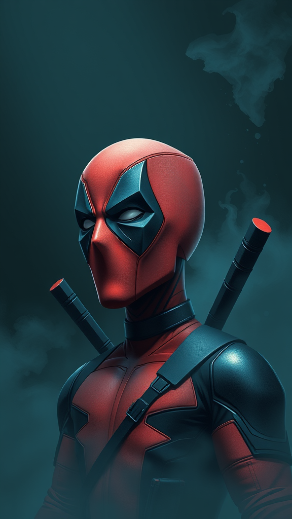 Deadpool in a dark mist, reimagined as a caricature with fluid, abstract forms reminiscent of Constantin Brâncuși's iconic style, exuding a serene yet dynamic presence in a surreal masterpiece composed of cool tones.