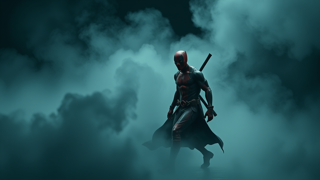 Deadpool wandering through a dark mist, sculpted in the unique style of Constantin Brâncuși; the composition is a serene yet dynamic surreal masterpiece, characterized by flowing forms and abstract humor, rendered in cool, moody tones.