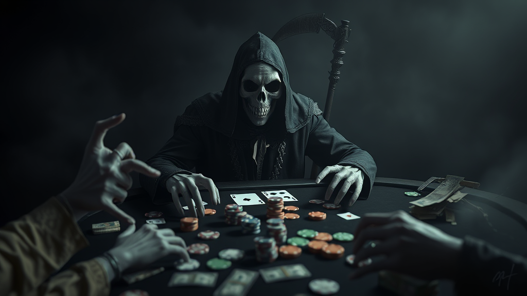 Death engaged in a poker game, surrounded by a shadowy, ominous setting with a scythe subtly positioned in the backdrop. The figure, with an expressionless gaze directed at the viewer, occupies a dimly lit table strewn with poker chips, cards, and heaps of money. The ambiance is chilling and unsettling, utilizing eerie CGI rendered in a surreal, dreamlike 3D style. Details appear distorted—hands with extra fingers, faces blurred with odd proportions, limbs irregular and fused. Quality is low, with visible JPEG artifacts, creating a sense of a deteriorating, haunting image with malformed anatomy and grotesque features that enhance the unsettling mood. Elements are amorphous and overlap, contributing to a sense of confusion and dread in a low-resolution, corrupted visual, accompanied by hints of a watermark or illegible signature.