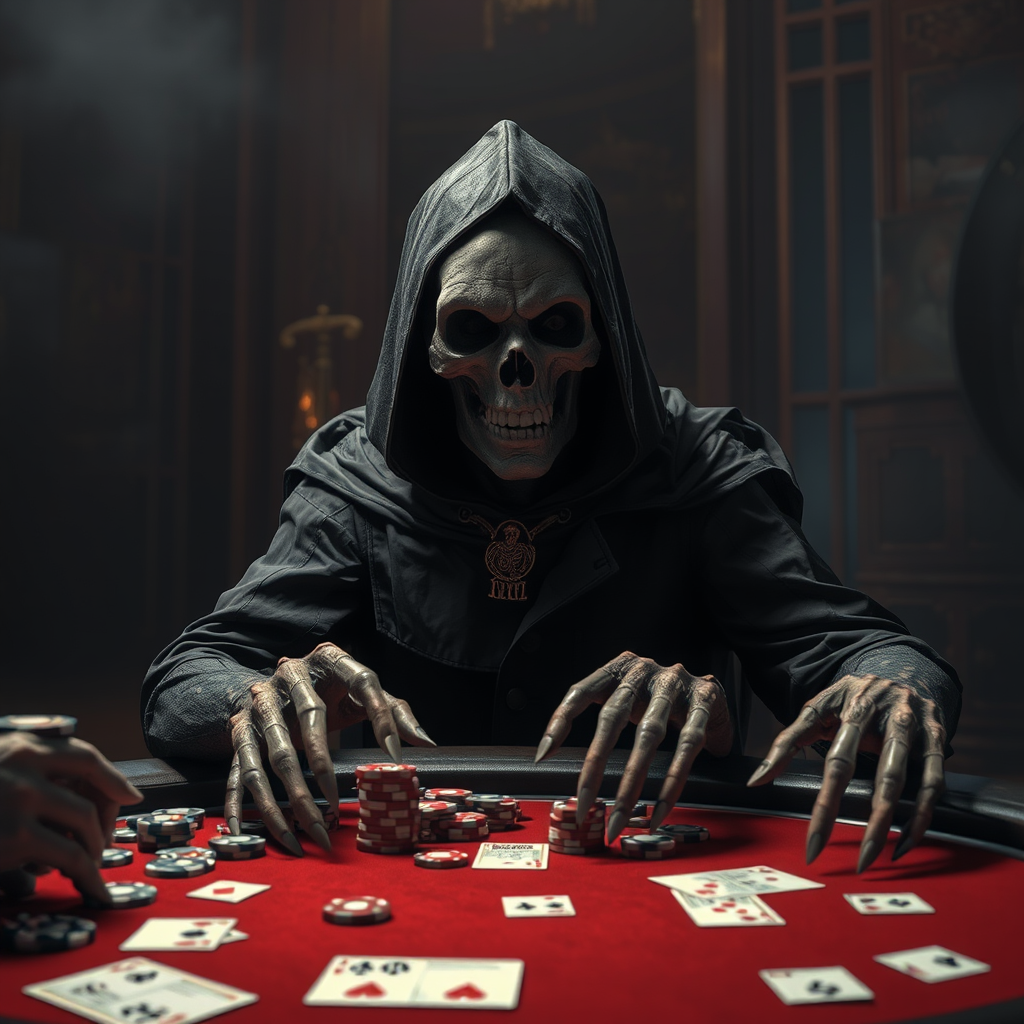 Death is seated at a poker table, surrounded by poker chips, cards, and money. The ominous presence of a scythe looms in the background as Death stares directly into the camera. The scene is rendered in eerie CGI, with unsettling elements like distorted anatomy and deformed features. The atmosphere is dark and morbid, evoking a sense of unease. The image is marred by noticeable imperfections such as low resolution, jpeg artifacts, and inconsistent proportions. There are unsettling aspects like extra fingers, malformed limbs, and a disfigured face, all contributing to the overall creepy and surreal feeling.