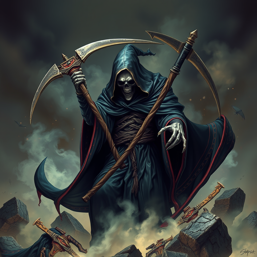 Death personified as the Grim Reaper, clutching a sickle, set against a shrouded, misty backdrop; a vivid and detailed masterpiece on a grand scale. Crafted in the hyper-realistic style reminiscent of a Yu-Gi-Oh! monster. The scene is vivid and unencumbered by frames or markings, ensuring high clarity and quality. The composition captures striking details and atmospheric depth, with Death portrayed as a formidable and enigmatic figure.