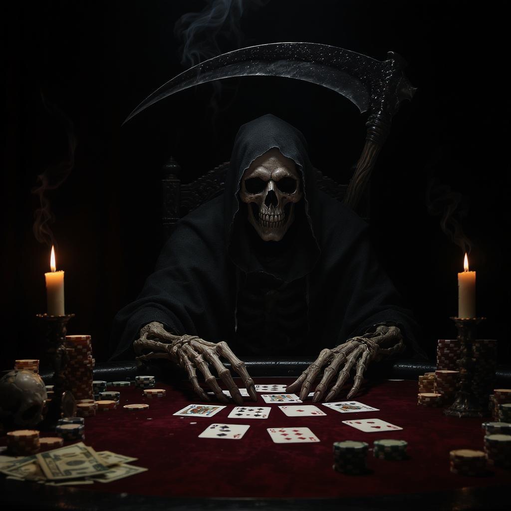 Death seated at a poker table, a dark, ominous atmosphere enveloping the scene. The iconic scythe looms in the background, casting eerie shadows. Death, shrouded in tattered robes, fixes a hollow gaze on the viewer, skeletal hands gripping cards and surrounded by scattered poker chips and piles of money. The dimly lit room adds a sense of foreboding, with flickering lights highlighting the worn textures of the table. Subtle details like cracked skulls on the playing cards and smoke curling from extinguished candles amplify the morbid ambiance. The tableau is haunting, a surreal blend of the supernatural and classic card game tension, evoking an unsettling mix of fear and curiosity.