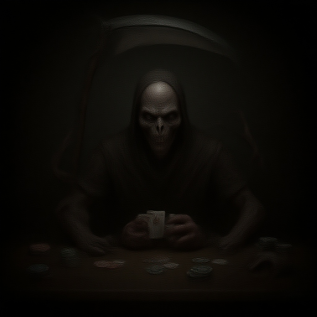 Death seated at a poker table with an ominous scythe looming in the background, poker chips scattered around, clutching a hand of cards while locking eyes with the viewer. The eerie atmosphere is emphasized by unsettling CGI elements, with distorted details like extra limbs and deformed hands. The scene's disfigured anatomy and gross proportions lend a morbid, surreal vibe. Blurry, low-resolution imagery with jpeg artifacts and low-quality rendering amplify the discomfort. Faces and limbs appear duplicated or mutated, with grotesque features and missing or fused body parts adding to the unsettling scene. A watermark and text errors might be visible, blending into the eerie, malformed composition.