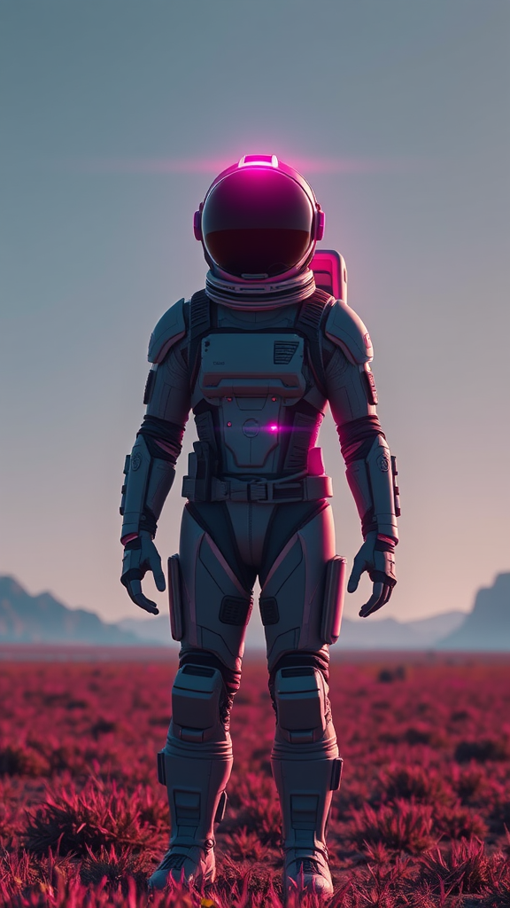 Death Stranding-inspired landscape, highly detailed anatomically correct male figure in futuristic astronaut suit standing in an open field facing forward, helmet emanating a vivid pink glow, dynamic lighting with high detail, ray tracing effects, cinematic illumination, deep shadows for dramatic contrast, with an exaggerated Unreal Engine 5 style rendering, capturing hyper-realistic features and intense lens flare, surreal and immersive atmosphere --ar 9:16