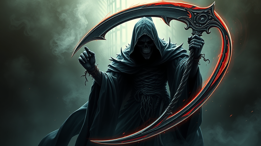 Death, the Grim Reaper himself, wielding a menacing scythe against a shadowy, mist-filled backdrop, portrayed on a colossal scale. The image embodies a detail-oriented, hyper-realistic style reminiscent of a Yugioh monster card, showcasing intricate textures and an uncanny lifelike appearance. The atmosphere evokes an eerie, otherworldly presence, drawing the viewer into the mysterious realm of darkness.